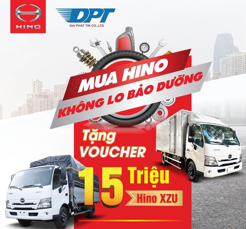 - Tặng Voucher trị giá 15.000.000 VNĐ cho khách hàng khi mua xe tải Hino XZU (bao gồm: Hino XZU650L 1.9 Tấn, Hino XZU710L 2.4 Tấn, Hino XZU720L 3.49 Tấn, Hino XZU650L -AP 3.49 Tấn và Hino XZU730L 5 Tấn) trong phân khúc Hino 300 Series. Áp dụng đến ngày 11/10/2023.