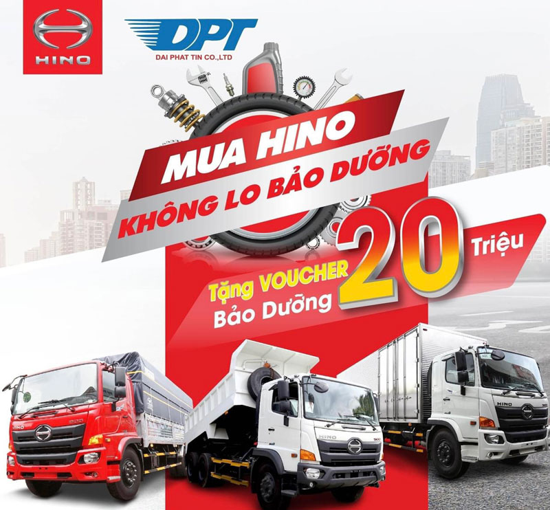 - Tặng Voucher trị giá 20.000.000 VNĐ cho khách hàng khi mua xe tải Hino 500 Series (bao gồm: Hino FG 8 Tấn, FL 15 Tấn. FM 15 Tấn). Áp dụng đến ngày 11/10/2023.